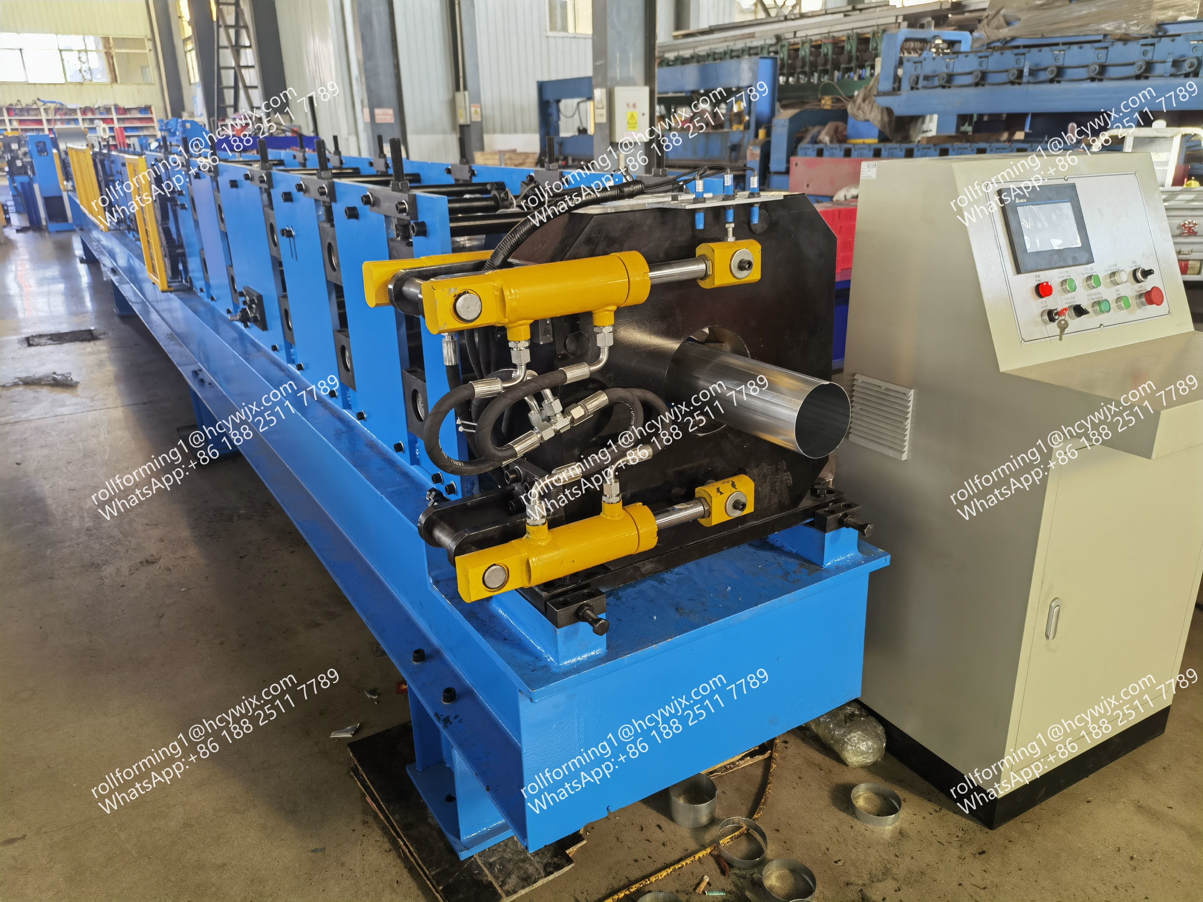 This is a machine that specializes in forming downspouts. Our factory is capable of customizing machines for round downspouts of various diameters and rectangular downspouts of different sizes. The forming method used is internal bite, resulting in a more aesthetically pleasing appearance of the final product.